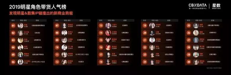 最近首屆互聯(lián)網(wǎng)影視文娛盛典推出的號稱國內(nèi)首份基于真實(shí)消費(fèi)數(shù)據(jù)的角色帶貨力榜單“2019明星角色帶貨人氣榜”。