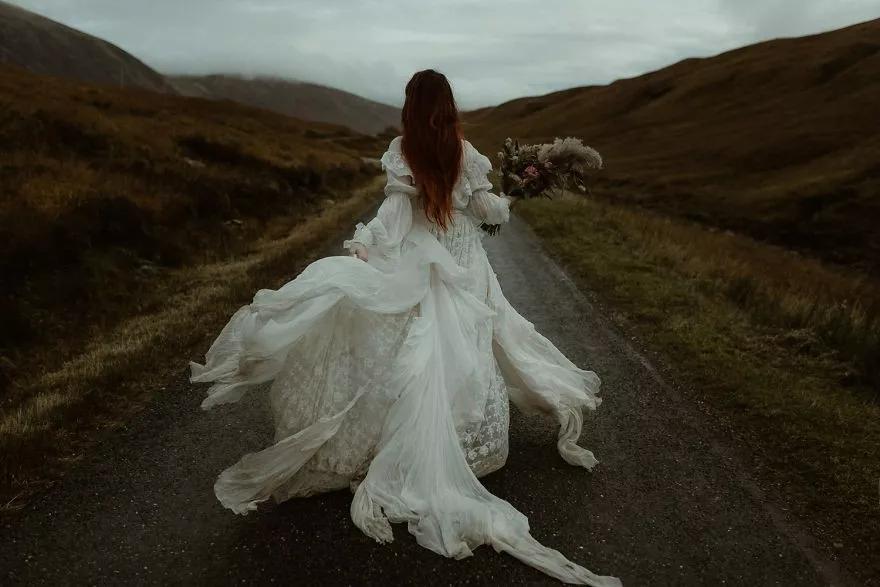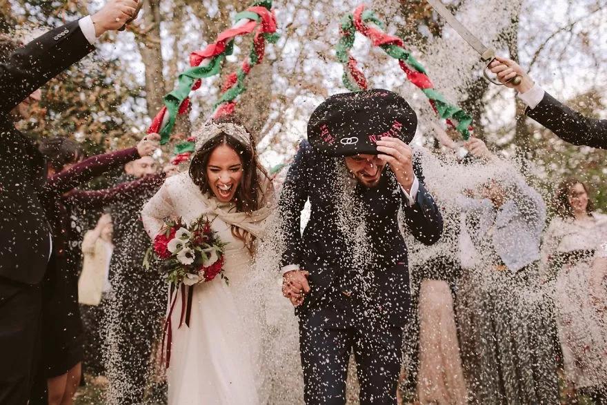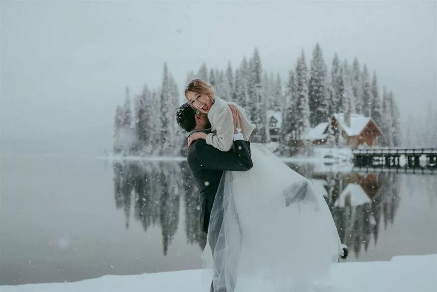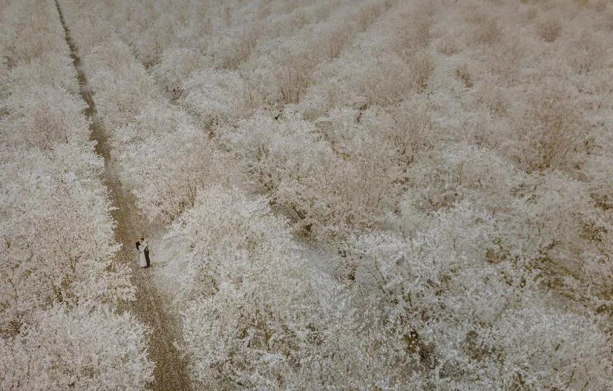 在這些照片中,新婚夫婦們在原野、在古堡里肆意奔跑,在漫天雪花中緊緊相擁,在落日余暉下留下甜蜜的剪影,在開滿花的樹林攜手漫步……盡情展露幸福的淚水和喜悅的笑容。