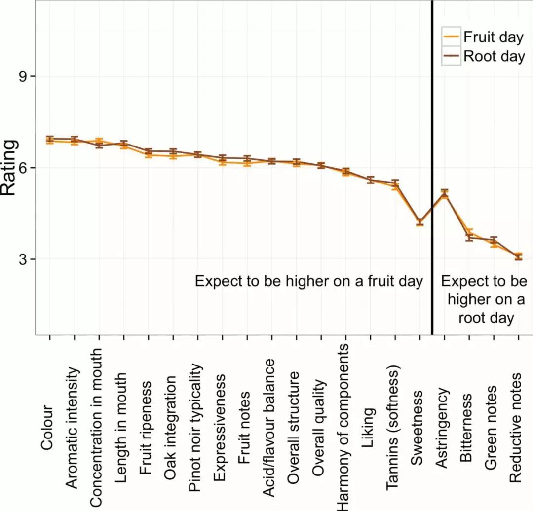 這還沒完,更有意思的是,整個(gè)實(shí)驗(yàn)里唯一表現(xiàn)出具有統(tǒng)計(jì)學(xué)意義差異的不是根日與果日之間,而是同樣的酒款在兩次根日之間、兩次果日之間表現(xiàn)出的顯著差異。