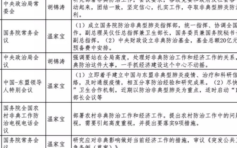 第二階段為2003年4月份加速擴(kuò)散期,疫情開(kāi)始向其他省份擴(kuò)散,并逐步向北京、山西、內(nèi)蒙古、河北和天津市集中。期間中央領(lǐng)導(dǎo)人密集召開(kāi)高級(jí)會(huì)議,部署非典防治工作。2003年4月非典疫情加快擴(kuò)散,截至4月底全國(guó)累計(jì)報(bào)告確診病例3460例,較3月底增加190.8%。其中華北5省、自治區(qū)、直轄市和廣東省有3368例,占確診案例的97.3%。期間中央政府密切關(guān)注非典疫情,據(jù)不完全統(tǒng)計(jì),自4月2日開(kāi)始的50天里,主要領(lǐng)導(dǎo)主持召開(kāi)的中央重大會(huì)議高達(dá)11次,平均4.5天一次,包括國(guó)務(wù)院常務(wù)會(huì)議、中央政治局會(huì)議和中央政治局常委會(huì)等高規(guī)格會(huì)議形式。非典防控期間的重大戰(zhàn)略決策幾乎都是在這些密集的會(huì)議上作出,比如4月23日的國(guó)常會(huì)成立了全國(guó)防控非典指揮部,并確定由吳儀副總理掛帥;4月28日的中央政治局會(huì)議確立了“一手抓非典防治,一手抓經(jīng)濟(jì)建設(shè)這個(gè)中心”;5月12日的國(guó)常會(huì)通過(guò)了《突發(fā)公共衛(wèi)生事件應(yīng)急條例》,為之后的突發(fā)公共衛(wèi)生事件的處理確立了流程。
