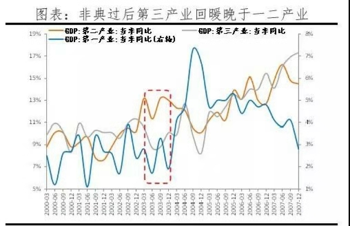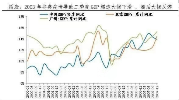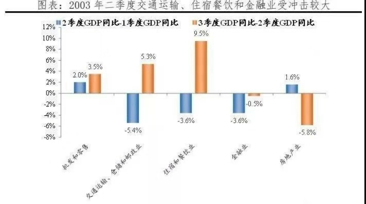 2003年非典期間,交通運(yùn)輸、住宿餐飲、金融等服務(wù)業(yè)所受沖擊較大,二季度GDP分項(xiàng)同比分別較一季度下滑5.4、3.6和3.6個(gè)百分點(diǎn)。
