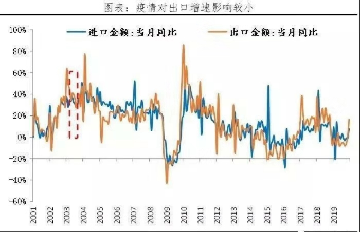 第三,一旦被WHO認(rèn)定為疫區(qū),出口可能受較大影響。若疫情升級(jí)為國(guó)際事件,國(guó)外將對(duì)來(lái)自疫區(qū)的商品提高準(zhǔn)入門(mén)檻或直接禁止進(jìn)入。非典對(duì)中國(guó)出口貿(mào)易影響相對(duì)有限,出口同比并未出現(xiàn)明顯下滑態(tài)勢(shì),僅在2003年4月略微下滑。