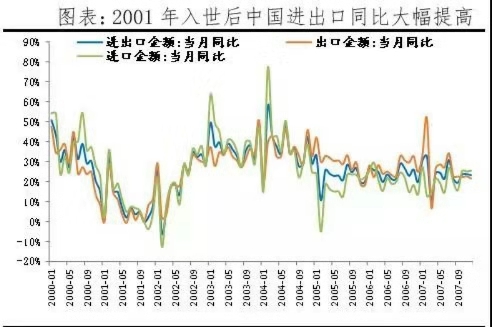 2003年中國(guó)正處于入世后的全球市場(chǎng)紅利期,美國(guó)因911事件需要攜手中國(guó)共同反恐,中美關(guān)系溫和,國(guó)際貿(mào)易活動(dòng)相對(duì)活躍。2001年中國(guó)加入WTO開(kāi)啟改革開(kāi)放新篇章,疊加美國(guó)出于反恐需要加強(qiáng)與中方合作,我國(guó)進(jìn)出口貿(mào)易迅速擴(kuò)張,出口同比自2001年7%附近上升至2003年30%水平。