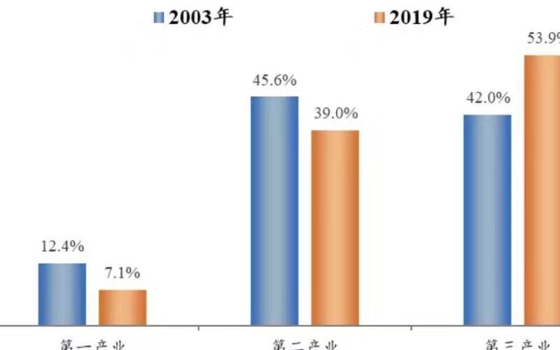 7、與2003年相比,當(dāng)前第三產(chǎn)業(yè)、消費(fèi)占比更高,而疫情對(duì)服務(wù)業(yè)消費(fèi)影響較大。2019年第一、二、三產(chǎn)業(yè)分別占比7.1%、39%和53.9%,一二產(chǎn)業(yè)分別較2003年下降5.3和6.6個(gè)百分點(diǎn),第三產(chǎn)業(yè)提高11.9個(gè)百分點(diǎn)。2019年最終消費(fèi)支出、資本形成總額和凈出口的經(jīng)濟(jì)貢獻(xiàn)率分別為57.8%、31.2%和11%,其中消費(fèi)的貢獻(xiàn)率高于2003年22.4個(gè)百分點(diǎn),資本形成總額的貢獻(xiàn)率低于2003年38.8百分點(diǎn)。