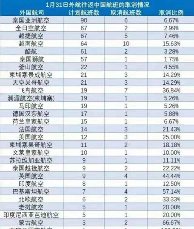 1月31日,30家中國(guó)內(nèi)地航空公司共計(jì)劃執(zhí)行1705個(gè)中國(guó)國(guó)際航班,其中25家航空公司共取消176個(gè)中國(guó)國(guó)際航班。