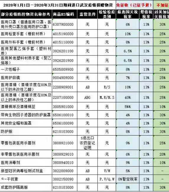 5、進(jìn)口且原產(chǎn)于美國(guó)的物資,不實(shí)施對(duì)美加征關(guān)稅措施,已加征稅款予以退還(2020.1.1-2020.3.31)。簡(jiǎn)而言之,就是海關(guān)不僅為疫情物資開(kāi)放綠色清關(guān)通道,還免所有進(jìn)口稅費(fèi)(企業(yè)自用或用于銷(xiāo)售的防護(hù)物資不適用“捐贈(zèng)物資”監(jiān)管方式,依然要繳納相關(guān)稅費(fèi))。