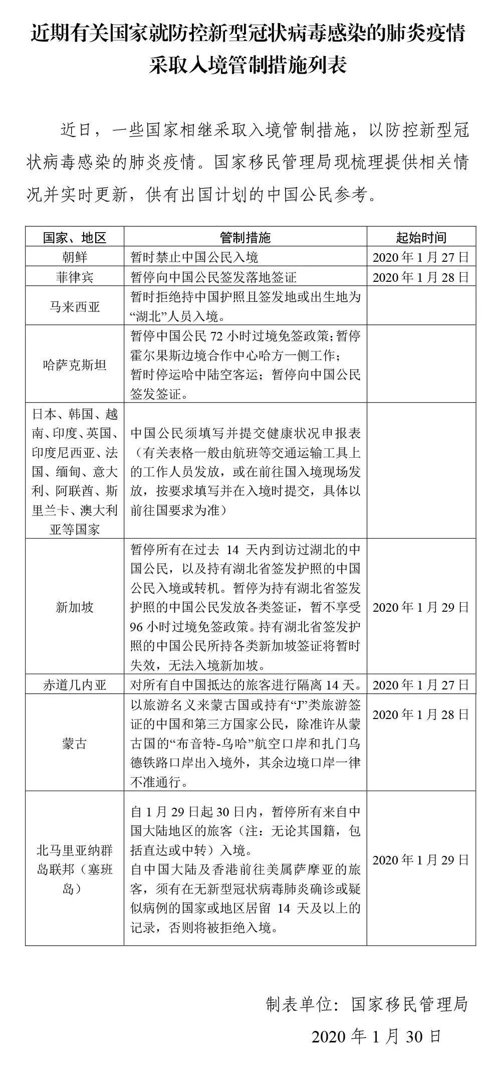 自1月27日起,暫停給予中國公民72小時(shí)免簽過境政策:加強(qiáng)對(duì)中國旅客的檢疫。
