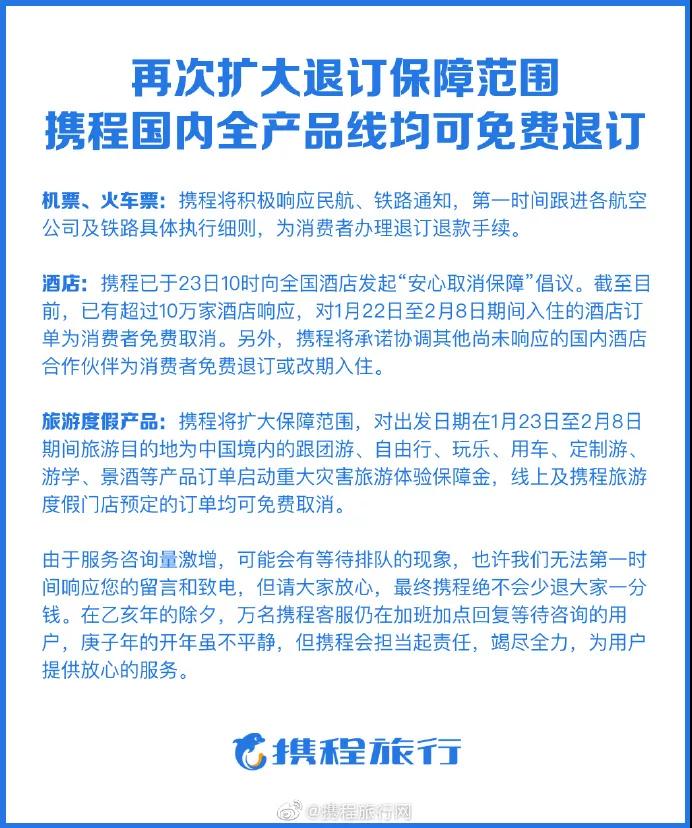 根據(jù)攜程1月31日晚間發(fā)布的“春運(yùn)退訂大數(shù)據(jù)”顯示,疫情發(fā)生以來(lái),截至1月30日,攜程客服收到的退改量為數(shù)百萬(wàn)單春節(jié)旅游訂單,客戶(hù)全球跟團(tuán)、半自助和定制游的訂單損失負(fù)擔(dān)至2月29日前。