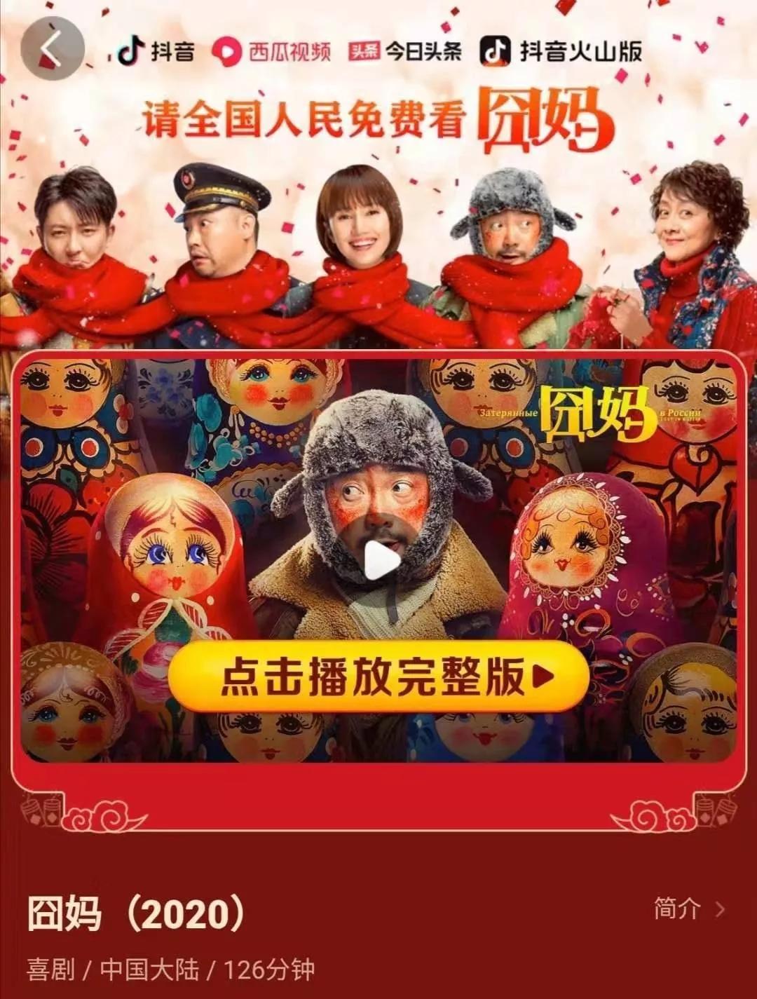 1月28日,字節(jié)跳動(dòng)對(duì)外宣布,截至1月27日零時(shí),電影《囧媽》在頭條系四大平臺(tái)(抖音、西瓜視頻、今日頭條、抖音火山版)及智能電視鮮時(shí)光三日總播放量超過(guò)6億,總觀(guān)看人次1.8億。統(tǒng)計(jì)顯示,2019年整個(gè)春節(jié)檔全部影片前三日的觀(guān)影人次為7378.1萬(wàn)。