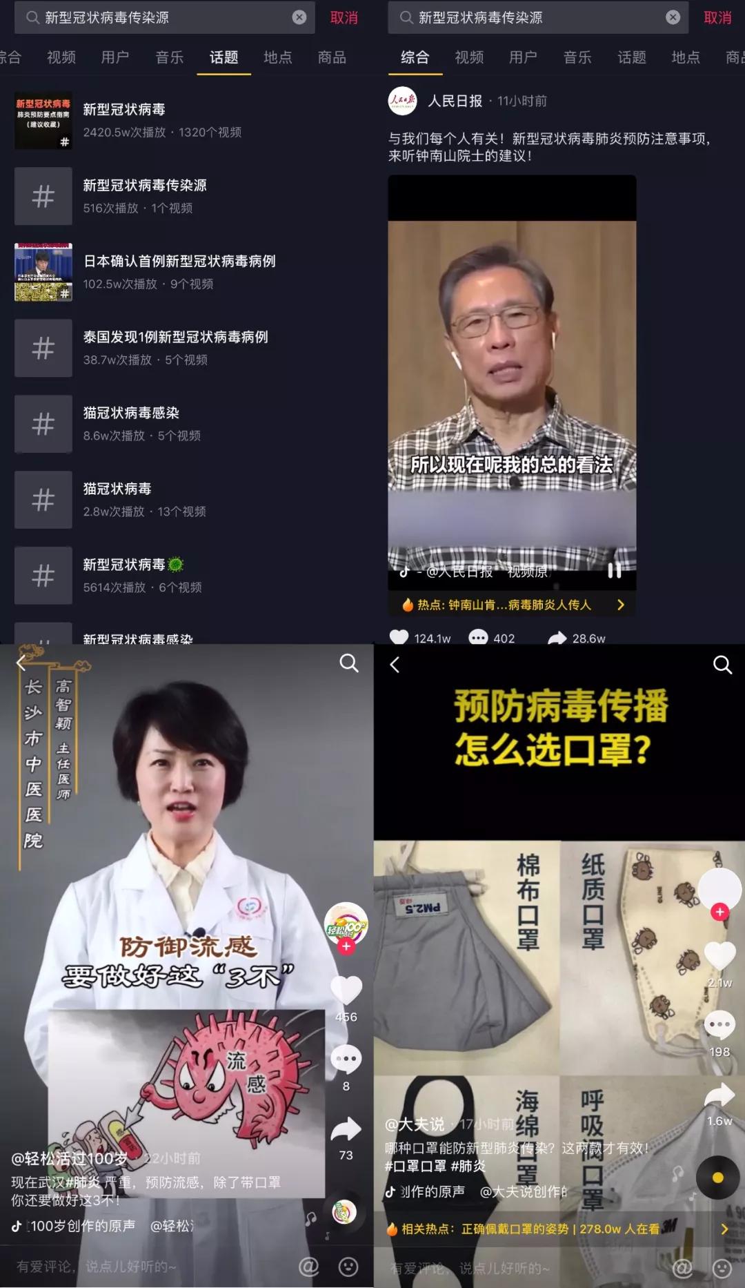 這一次的疫情趕上春節(jié),也正好是各大短視頻平臺(tái)火熱營(yíng)銷(xiāo)的時(shí)機(jī),加上春節(jié)營(yíng)銷(xiāo)的一層因素,抖音快手也能在疫情期間,抓住國(guó)民注意力流量,展現(xiàn)出作為內(nèi)容平臺(tái)的媒體與社會(huì)價(jià)值。 在快手抖音的熱搜上,“冠狀病毒肺炎”相關(guān)的話(huà)題都位列其中,人民日?qǐng)?bào)發(fā)布的“鐘南山院士建議”、“習(xí)近平重要指示”,央視網(wǎng)發(fā)布的“冠狀病毒最新確診病例”等短視頻,播放量都在100萬(wàn)以上,也都得到用戶(hù)極大的關(guān)注與討論熱度。