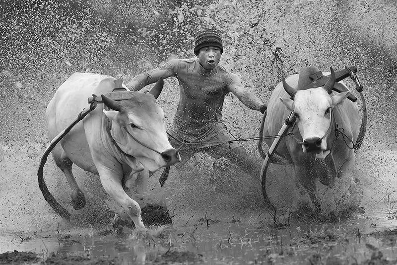 小孩拿著這個布袋在水里跳,躺在泥巴里面的這一個足球,還有泥巴中的奔牛,基本是屬于印尼的題材。所以這些照片基本很適合做低飽和度或者黑白,因為畫面有很強(qiáng)的影調(diào),而且動感很足,所以很適合用黑白表現(xiàn)這些題材。