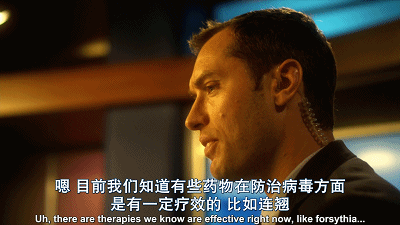 網(wǎng)絡(luò)大V開始造謠,并且宣稱“連翹”對病毒有效!(而實際上裘德洛扮演的網(wǎng)絡(luò)大V跟對沖基金合謀利用恐慌炒作股票)