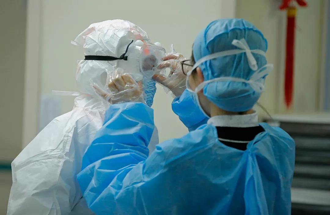 由于防護(hù)服一人穿起來很麻煩,一位護(hù)士讓別人幫忙調(diào)整目鏡。
