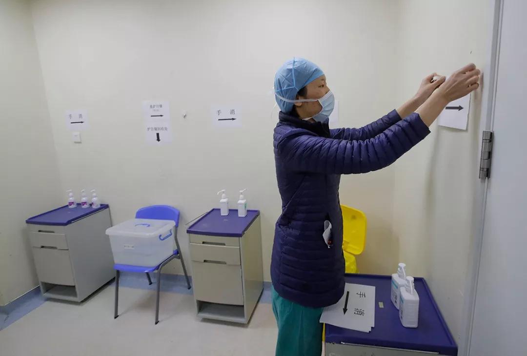 武漢協(xié)和醫(yī)院西院新冠病房開始投用前一小時(shí),醫(yī)護(hù)人員在半污染區(qū)做最后的準(zhǔn)備。