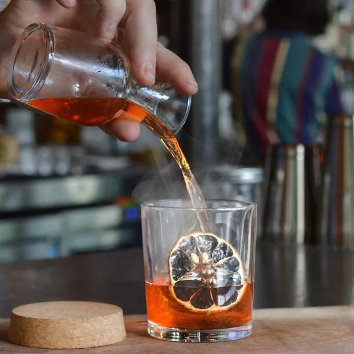 配方:2.5盎司Four Roses美國(guó)純波本威士忌、1/2盎司Aperol開胃酒、兩滴迷迭香雞尾酒香料苦精、煙熏冰塊