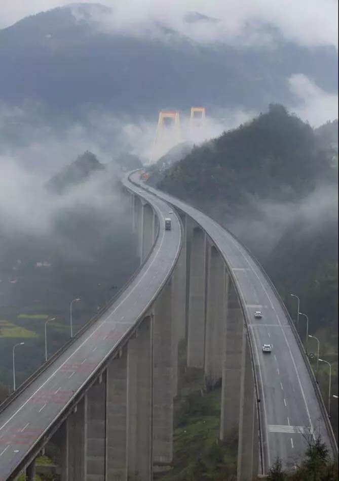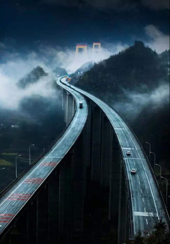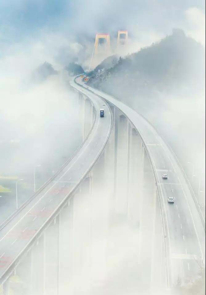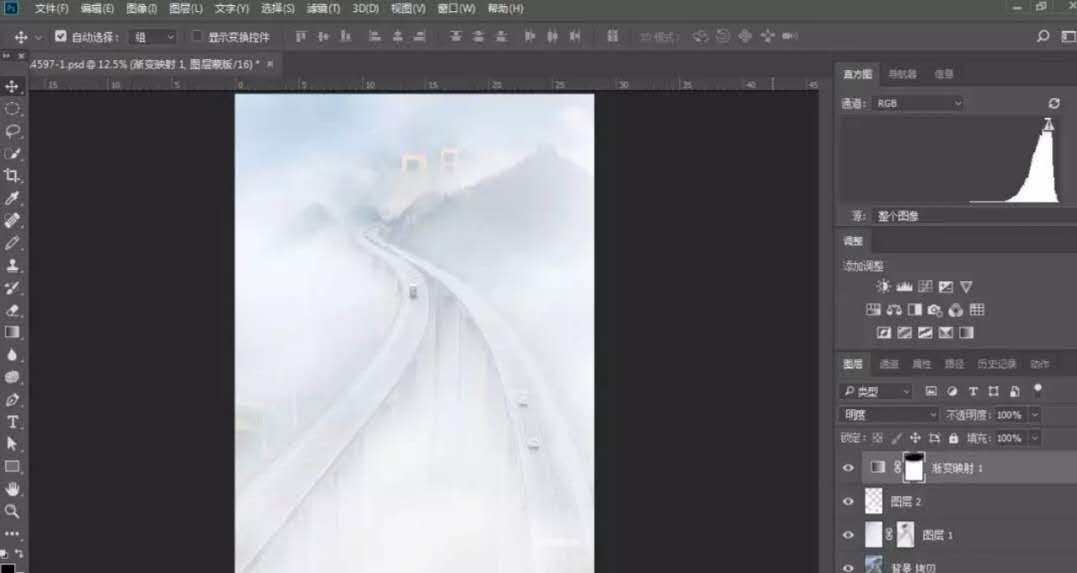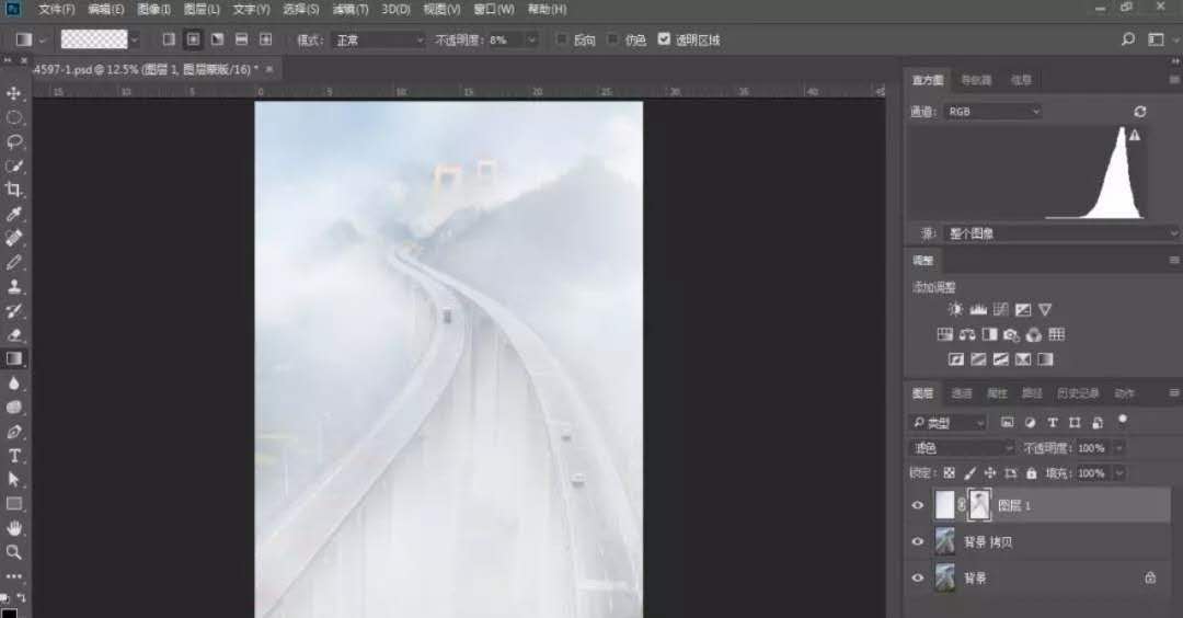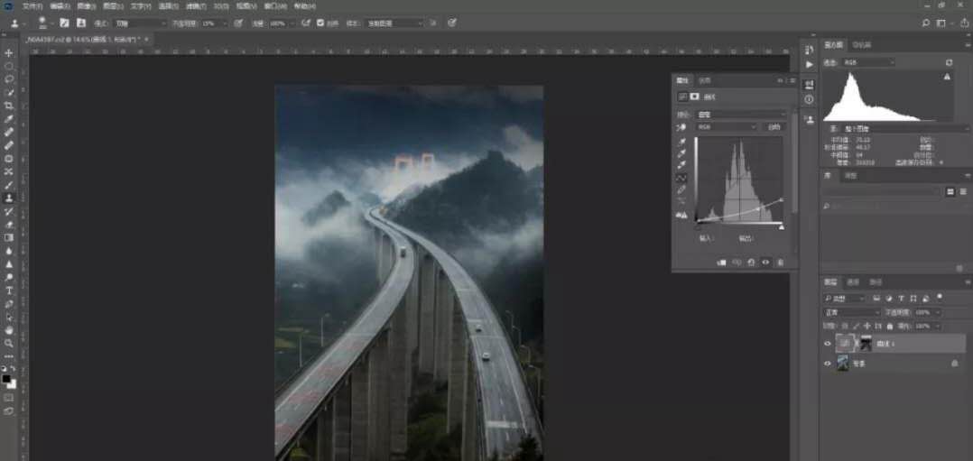 對原圖作適當?shù)牟眉簦巩嬅娓雍啙崱S镁匦翁姿鞴ぞ哌x取部分云霧,通過自由變換覆蓋整個畫面,選擇濾鏡-模糊-高斯模糊,對新圖層進行模糊處理,使云霧更自然,選擇圖層混合模式為濾色,并為該圖層建立蒙版,點擊“漸變工具”,選擇從前景色黑到背景色白的漸變,再選擇“徑向漸變”,前景色為黑色,用不透明度8%左右,編輯蒙板,擦出高架橋的部分,最后對該蒙版作適當?shù)挠鸹?/span>