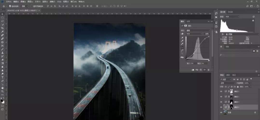 回到背景圖層,再選擇快速選擇工具(屬性中選擇添加選區(qū))選擇兩條高速路執(zhí)行曲線調(diào)整層工具,通過S型曲線調(diào)整加強高速路的反差,點擊曲線調(diào)整層蒙版滑動下羽化滑塊,稍微羽化選區(qū)。通過這一步驟調(diào)整目的是加強高速路的質(zhì)感。