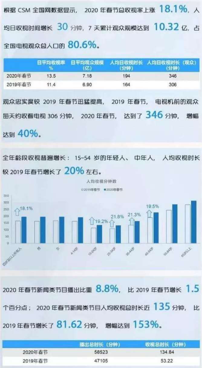 足不出戶、居家過年成為2020年全國人民的春節(jié)度假模式,電視再次彰顯出強(qiáng)者的力量。觀眾忠實(shí)度較2019年春節(jié)迅猛提高,2019年春節(jié),電視機(jī)前的觀眾每天約收看電視306分鐘,2020年春節(jié),達(dá)到了346分鐘,增幅達(dá)到40%。