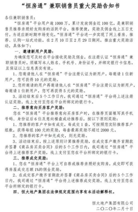 恒大“75折優(yōu)惠”線上營銷,讓疫情之下房企的線上賣房模式受到關(guān)注。2月10日,恒房通上線分銷激勵,針對自購、推薦他人購買、第三方購買、推薦新客戶等不同情況,推出了不同傭金及獎勵,比如說推薦別人購買的,不僅定金全額返還,并可獲1%傭金及1萬元獎勵。
