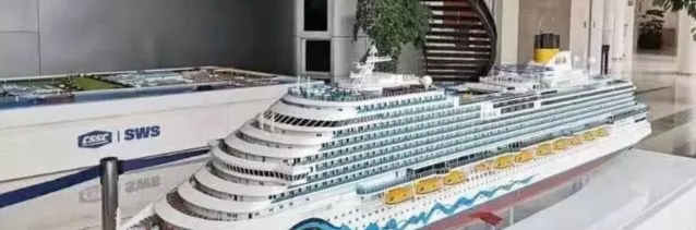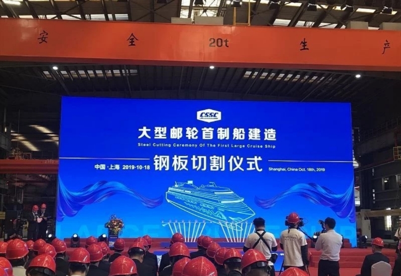 如果說效果圖是品牌還沒確定的產物,2019年10月18日上午10時40分左右,我國首艘國產大型郵輪在上海正式開工建設,現(xiàn)場的圖片依然是這樣的: