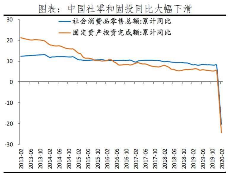以中國為例,2020年1-2月,中國社會消費(fèi)品零售總額和固定資產(chǎn)投資完成額累計(jì)同比分別從2019年12月的8.0%和5.4%下滑至-20.5%和-24.5%,工業(yè)增加值累計(jì)同比從5.7%下滑至-13.5%,2月制造業(yè)PMI從1月的50.0下滑至35.7,均創(chuàng)數(shù)據(jù)公布以來的最低值,遠(yuǎn)超2003年SARS和2008年國際金融危機(jī)。一季度GDP大概率負(fù)增長。