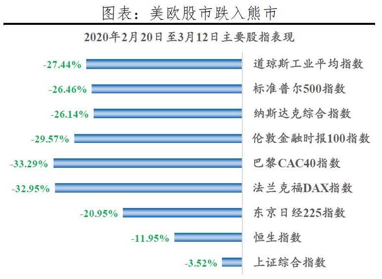 近期美歐主要股市跌幅均超過20%,跌入技術(shù)性熊市,美股甚至3次熔斷,而A股跌幅較小、相對(duì)穩(wěn)健,一方面反應(yīng)了中國(guó)在抗擊疫情和恢復(fù)生產(chǎn)方面的積極進(jìn)展,另一方面也反應(yīng)了投資者對(duì)歐美疫情蔓延更嚴(yán)重更久、陷入經(jīng)濟(jì)衰退、引爆金融危機(jī)等的擔(dān)心。而事實(shí)上投資者已經(jīng)在往流動(dòng)性危機(jī)、金融危機(jī)的方向進(jìn)行恐慌性交易,風(fēng)險(xiǎn)資產(chǎn)暴跌,資金躲進(jìn)避險(xiǎn)資產(chǎn),甚至搶流動(dòng)性。