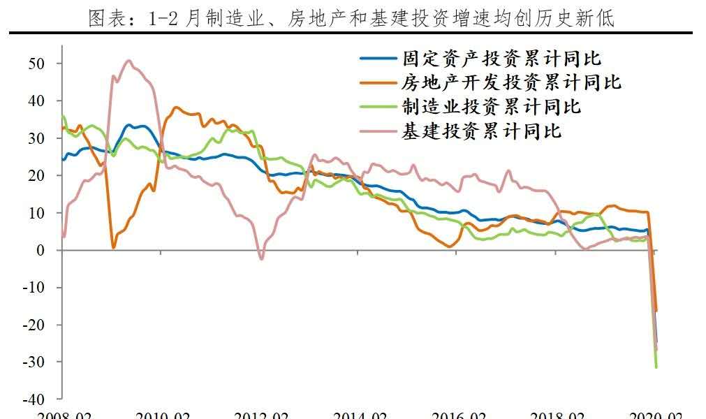 固定資產(chǎn)投資增速創(chuàng)歷史新低,民間投資下滑幅度更大。1-2月固定資產(chǎn)投資累計(jì)同比-24.5%,較去年全年下滑29.9個(gè)百分點(diǎn),較去年12月當(dāng)月同比下滑36.3個(gè)百分點(diǎn),創(chuàng)歷史新低。分產(chǎn)業(yè)看,第一、二、三產(chǎn)業(yè)投資同比分別為-25.6%、-28.2%、-23.0%,分別較去年全年下滑26.2、31.4、29.5個(gè)百分點(diǎn)。分地區(qū)看,東部、中部、西部、東北地區(qū)同比分別為 -20.2%、-32.7%、-25.0%、-18.9%,分別較去年全年下滑24.3、42.0、30.6、21.9個(gè)百分點(diǎn)。從投資主體看,民間固定資產(chǎn)投資同比-26.4%,較去年全年下滑31.3個(gè)百分點(diǎn),下滑幅度大于整體。