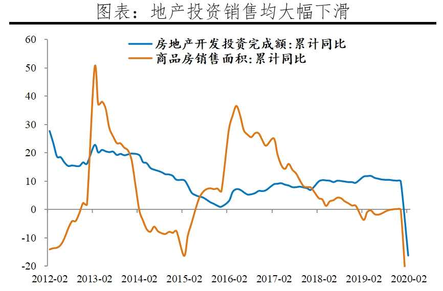 1-2月房地產(chǎn)投資累計(jì)同比-16.3%,較去年12月下滑23.7個(gè)百分點(diǎn),創(chuàng)歷史新低。1)土地購(gòu)置負(fù)增長(zhǎng),但土地溢價(jià)率較去年三四季度有所恢復(fù)。部分百?gòu)?qiáng)企業(yè)前兩月在土地市場(chǎng)零投資,1-2月土地購(gòu)置面積累計(jì)同比-29.3%,較去年12月下滑36.8個(gè)百分點(diǎn)。據(jù)中指院數(shù)據(jù),1-2月300城土地平均成交溢價(jià)率分別為11.6%和11.1%,而去年三四季度分別為10%和9%,300城住宅用地流拍面積減少37%。2)新開工、竣工增速均暴跌。1-2月新開工面積、施工面積、竣工面積累計(jì)同比分別為-44.9%、2.9%、-22.9%,分別較12月下滑52.3、6.2和43.1個(gè)百分點(diǎn)。3)庫存去化速度放緩,但仍處歷史低位。1-2月商品房待售面積累計(jì)同比為1.4%,較12月上升5.2個(gè)百分點(diǎn),但由于此前庫存去化充分,當(dāng)前商品房待售面積仍為近五年低位水平。未來復(fù)工推進(jìn)、地產(chǎn)銷售復(fù)蘇、加快期房竣工和舊改等,將托底房地產(chǎn)投資。