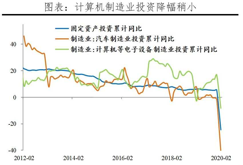 41個(gè)大類行業(yè)中僅油氣開采和煙草2個(gè)行業(yè)增加值同比正增長(zhǎng),612種產(chǎn)品中僅79種產(chǎn)品同比增長(zhǎng),部分高技術(shù)產(chǎn)品保持較快增長(zhǎng)。而在去年12月,41個(gè)行業(yè)中有33個(gè)正增長(zhǎng),605種產(chǎn)品有365種正增長(zhǎng)。1)1-2月汽車工業(yè)重回負(fù)增長(zhǎng),同比-31.8%,較12月大幅下滑42.2個(gè)百分點(diǎn)。分車型產(chǎn)量看,SUV、轎車和新能源車產(chǎn)量同比分別為-41.3%、-49.8%和-62.8%。2)出口相關(guān)產(chǎn)業(yè)電氣機(jī)械、金屬制品、通用設(shè)備、專用設(shè)備、橡膠塑料和紡織工業(yè)增加值同比分別為-24.7%、-26.9%、-28.2%、-24.4%、-25.2%和-27.2%,分別下滑37.1、33.2、33.1、30.9、28.9和27.4個(gè)百分點(diǎn)。3)鋼鐵有色等連續(xù)生產(chǎn)型行業(yè)降幅稍小。有色和黑色金屬冶煉同比分別為-8.5%和-2%,分別下滑13.5和12.7個(gè)百分點(diǎn)。4)疫情提振醫(yī)療防護(hù)和生活物資需求,口罩、發(fā)酵酒精產(chǎn)量同比分別為127.5%和15.6%,凍肉和方便面同比分別為13.5%和11.4%。5)部分高技術(shù)產(chǎn)品智能手表、智能手環(huán)、半導(dǎo)體分立器件和集成電路產(chǎn)量同比分別為119.7%、45.1%、31.4%和8.5%。分地區(qū)看,東部、中部、西部和東北地區(qū)同比分別為-16.9%、-16.7%、-7.6%和-11.5%,分別較12月下降23.8、23.4、15.4和20.5個(gè)百分點(diǎn)。