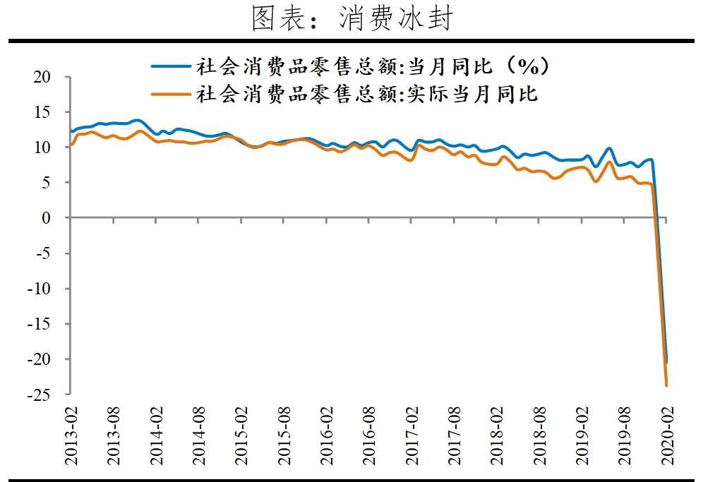 消費(fèi)冰凍,僅糧油食品、飲料、藥品等少數(shù)維持正增長(zhǎng)。1-2月社會(huì)消費(fèi)品零售總額名義和實(shí)際增速分別為-20.5%和-23.7%,分別較去年12月大幅下滑28.5和28.2個(gè)百分點(diǎn),均創(chuàng)1995年公開數(shù)據(jù)以來的歷史新低;除汽車外社會(huì)消費(fèi)品零售額同比-18.9%,下滑19.7個(gè)百分點(diǎn)。從消費(fèi)品類看,餐飲消費(fèi)接近腰斬,汽車、石油及制品和地產(chǎn)相關(guān)消費(fèi)品大幅下滑,糧油食品類消費(fèi)保持增長(zhǎng)。1)1-2月餐飲和商品消費(fèi)同比分別為-43.1%和-17.6%,分別較12月下滑52.2和25.5個(gè)百分點(diǎn)。2)因出行需求大幅減少,汽車、石油及制品消費(fèi)同比分別為-37.0%、-26.2%,分別下滑38.8和30.2個(gè)百分點(diǎn)。3)家具、家用電器和建筑裝潢材料消費(fèi)增速分別為-33.5%、-30%和-30.5%,分別下滑35.3、32.7和31.1個(gè)百分點(diǎn)。4)升級(jí)類消費(fèi)品珠寶、服裝和化妝品類消費(fèi)同比分別為-41.1%、-30.9%和-14.1%,分別下滑44.8、32.8和26個(gè)百分點(diǎn)。5)實(shí)物商品網(wǎng)上零售額增速3%,較2019年下滑16.5個(gè)百分點(diǎn)。其中,吃、穿、用類增速分別為26.4%、-18.1%、7.5%,分別下滑4.5、33.5和12.3個(gè)百分點(diǎn);必需消費(fèi)品糧油食品類消費(fèi)增速9.7%,與12月持平。從消費(fèi)區(qū)域看,城鎮(zhèn)和農(nóng)村消費(fèi)增速分別為-20.7%和-19%,分別較12月下滑28.5和28.1個(gè)百分點(diǎn)。
