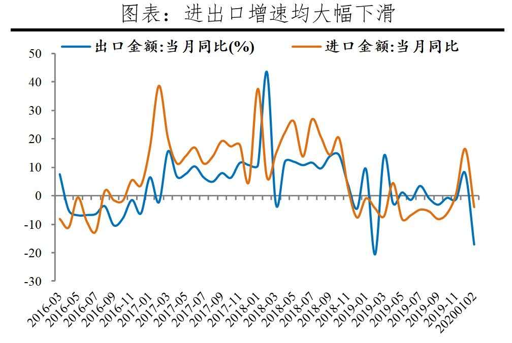 出口大幅下滑,主因疫情導(dǎo)致部分國(guó)家對(duì)華貿(mào)易管制以及國(guó)內(nèi)企業(yè)延遲復(fù)工;進(jìn)口增速下滑幅度不及出口,貿(mào)易差額由正轉(zhuǎn)負(fù)。1-2月中國(guó)出口(以美元計(jì))累計(jì)同比-17.2%,較去年12月下滑25.1個(gè)百分點(diǎn);進(jìn)口(以美元計(jì))累計(jì)同比-4.0%,下滑20.5個(gè)百分點(diǎn);貿(mào)易差額-71億美元,減少543.1億美元。出口方面,對(duì)主要地區(qū)均不同程度下滑,勞動(dòng)密集型產(chǎn)品出口下滑幅度最大。1-2月中國(guó)對(duì)美國(guó)、歐盟、日本、東盟、中國(guó)香港和韓國(guó)的出口累計(jì)同比分別為-27.7%、-18.4%、-24.5%、-5.1%、-20.4%和-18.6%,均較去年12月下滑10個(gè)百分點(diǎn)以上;七大勞動(dòng)密集型產(chǎn)品、機(jī)電產(chǎn)品和高新技術(shù)產(chǎn)品出口累計(jì)同比分別為-26.3%、-16.2%和-15.2%,均下滑15個(gè)百分點(diǎn)以上。進(jìn)口方面,大宗商品進(jìn)口同比較上月上升。1-2月農(nóng)產(chǎn)品、機(jī)電產(chǎn)品、高新技術(shù)產(chǎn)品進(jìn)口累計(jì)同比分別為5.1%、-7.4%、-5.4%,均較12月下滑20個(gè)百分點(diǎn)以上;大宗商品進(jìn)口累計(jì)同比為15.0%,較12月上升3.8個(gè)百分點(diǎn)。