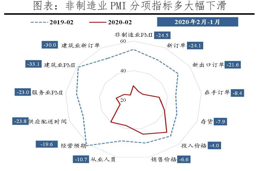2月制造業(yè)PMI指數(shù)為35.7%,較上月大幅下滑14.3個(gè)百分點(diǎn),低于2008年11月全球金融危機(jī)時(shí)的38.8%。分項(xiàng)來看:1)生產(chǎn)放緩。2月PMI生產(chǎn)指數(shù)為27.8%,較上月大幅下滑23.5個(gè)百分點(diǎn),與疫情沖擊下企業(yè)延遲復(fù)工、生產(chǎn)停滯有關(guān)。2)內(nèi)外需求疲弱。2月新訂單和新出口訂單指數(shù)分別為29.3%和28.7%,分別較上月大幅下滑22.1和20.0個(gè)百分點(diǎn)。3)價(jià)格指數(shù)下滑,企業(yè)虧損和通縮風(fēng)險(xiǎn)加大。2月原材料和出廠價(jià)格指數(shù)分別為51.4%和44.3%,較上月分別下滑2.4和4.7個(gè)百分點(diǎn)。出廠價(jià)格和原材料價(jià)格指數(shù)差值擴(kuò)大,中下游企業(yè)盈利壓力加大。4)采購(gòu)量和經(jīng)營(yíng)預(yù)期指數(shù)大幅下滑,原材料庫存大降、產(chǎn)成品庫存積壓。2月原材料庫存指數(shù)較上月下滑13.2個(gè)百分點(diǎn),后期有較強(qiáng)補(bǔ)庫存需求;產(chǎn)成品庫存指數(shù)較上月上升0.1個(gè)百分點(diǎn),反映疫情期間物流堵塞、消費(fèi)放緩導(dǎo)致的庫存積壓。5)大中小型企業(yè)PMI均大幅下滑,中小企業(yè)受沖擊更大。2月大中小型企業(yè)PMI指數(shù)分別為36.3%、35.5%和34.1%,較上月分別下滑14.1、14.6和14.5個(gè)百分點(diǎn)。