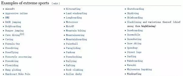 45. 極限雙板滑雪(Extreme Skiing):雖然wiki列表里寫的是雙板滑雪(snow skiing),但是打開鏈接就是極限雙板滑雪(Extreme Skiing)。一般是指在坡度超過45度的自然雪山上進行滑降的極限運動,一般是直升機把參與者帶到某個山脊或者山頂位置然后參與者從雪山上滑下。
