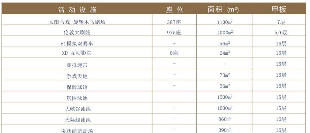在意大利知名兒童品牌智高(CHICCO)細(xì)心安全的設(shè)施和目不暇接的可愛玩具中,3 歲以下的寶 寶盡情探索童真的小宇宙;3-11 歲的寶貝能再繽紛的樂高(LEGO)海上樂園中組裝自己的海上城堡,12-17 歲的青少年更設(shè)有各種球類運(yùn)動(dòng)兼容的多功能運(yùn)動(dòng)場、82 米喜馬拉雅滑水道和 F1 模擬 賽車等,讓青春期的小大人在高端安全的空間中自在冒險(xiǎn)。