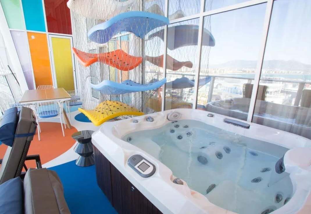 皇家加勒比公司希望通過手機登船系統(tǒng)和面部識別軟件來改善乘客的登機過程。一旦上了船,乘客會發(fā)現(xiàn)一些改進,包括增加的14個陽臺艙和14個可以俯瞰中央步行路區(qū)域的船艙,以及一個新的內(nèi)部艙的虛擬陽臺屏幕系統(tǒng)。最引人注目的是皇家加勒比的第一套兩層甲板高、1,346平方英尺的終極家庭套房(The Ultimate Family Suite)。最終的家庭套房是船上最大的套房之一,并以家庭友好的設施自助餐為特色,套房最多可容納八人,包括從孩子們臥室 (upper level) 到樓下的客廳設有室內(nèi)滑梯 ,地板到天棚的樂高積木墻,桌上冰球, 2 掛蛋式秋千椅,一間電視電影室 (3D movies, 爆米花機, 媒體書庫, 視頻游戲控制臺 )和一間小廚房。陽臺(sized 20 平方米 / 210 平方英尺)上有一個大臺球桌、一個小型攀巖墻和一個按摩浴缸。