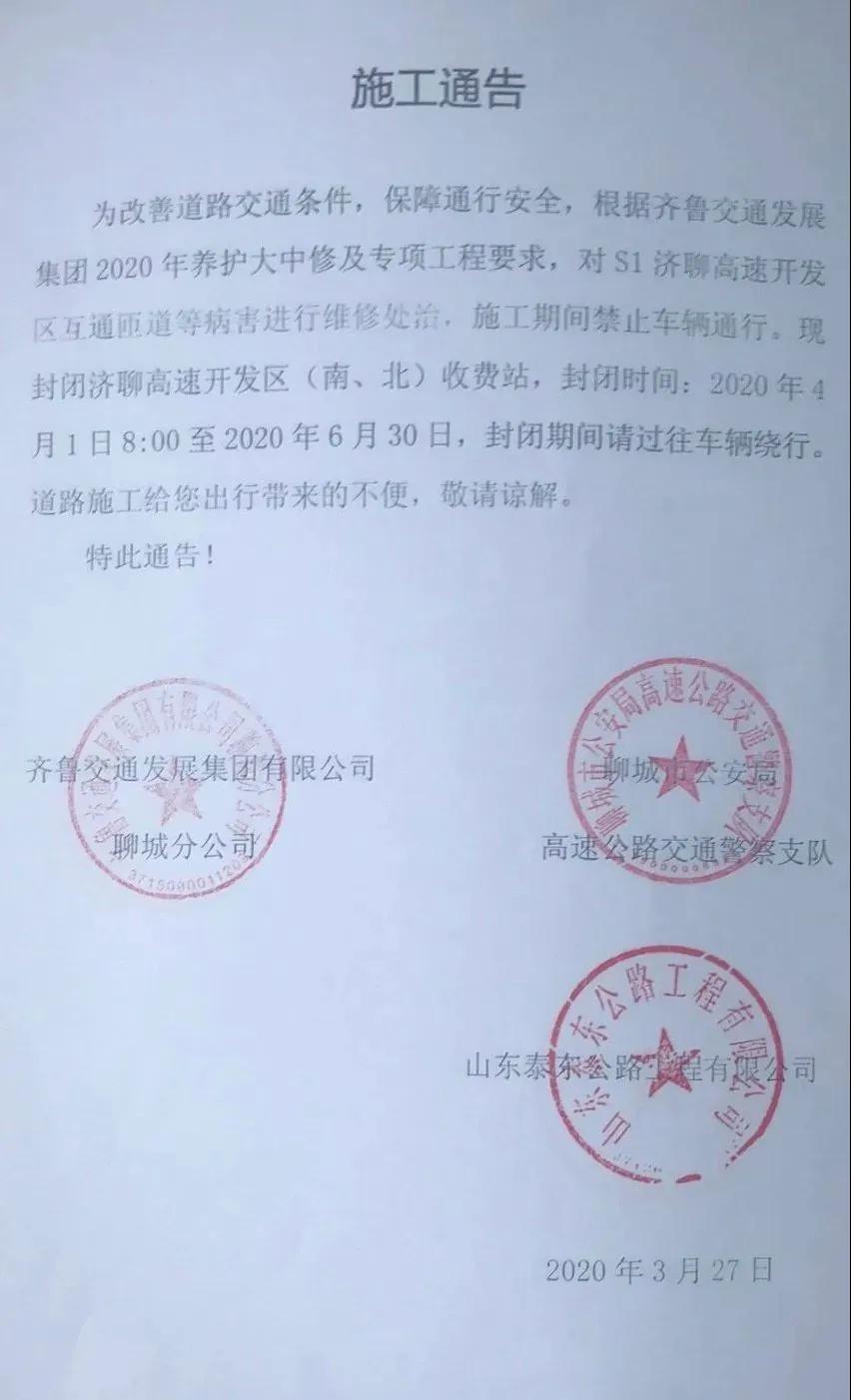 因濟(jì)聊高速開(kāi)發(fā)區(qū)互通立交施工需要,2020年4月1日8:00至2020年6月30日,封閉濟(jì)聊高速聊城開(kāi)發(fā)區(qū)收費(fèi)站(南北崗),封閉期間請(qǐng)過(guò)往車(chē)輛繞行,道路施工給您出行帶來(lái)的不便,敬請(qǐng)諒解。