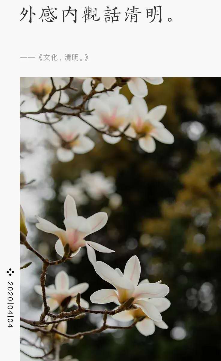 清明,我們又一次進(jìn)入化文的狀態(tài)。細(xì)雨紛紛,煙柳垂淚,行人斷魂,是對逝者的緬懷和尊敬;萬物生長,惠風(fēng)和暢,天清地明,是對生者的祝福和期待;萬物有靈,春發(fā)幾枝,懵懂初醒,是對靈者的啟示和生發(fā)……