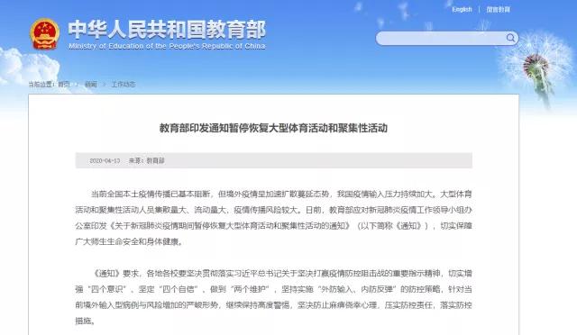 當前全國本土疫情傳播已基本阻斷,但境外疫情呈加速擴散蔓延態(tài)勢,我國疫情輸入壓力持續(xù)加大。大型體育活動和聚集性活動人員集散量大、流動量大,疫情傳播風險較大。日前,教育部應對新冠肺炎疫情工作領導小組辦公室印發(fā)《關于新冠肺炎疫情期間暫停恢復大型體育活動和聚集性活動的通知》(以下簡稱《通知》),切實保障廣大師生生命安全和身體健康。