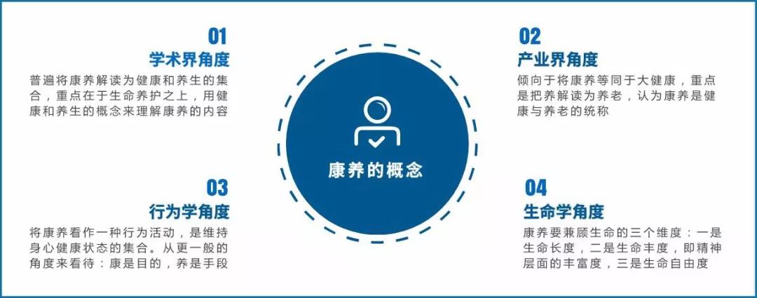 產(chǎn)業(yè)界角度:傾向于將康養(yǎng)等同于“大健康”,重點將“養(yǎng)”理解成“養(yǎng)老”。認為“康養(yǎng)”是“健康”與“養(yǎng)老”的統(tǒng)稱。
