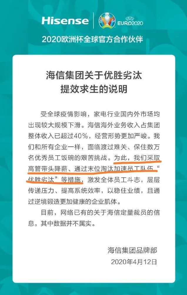 海信集團采取高管帶頭降薪、通過末位淘汰加速員工隊伍“優(yōu)勝劣汰”等措施,激發(fā)全體員工斗志,層層傳遞壓力、提高系統(tǒng)效率,以穩(wěn)住業(yè)績,且通過逆境鍛造更加健康的企業(yè)肌體。”