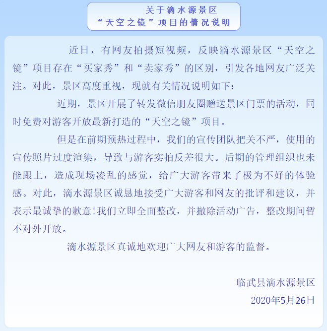 滴水源景區(qū)的“天空之鏡”就這樣成為另類(lèi)“新晉網(wǎng)紅”,在網(wǎng)友嘲諷之下,景區(qū)不得不刊登道歉聲明: