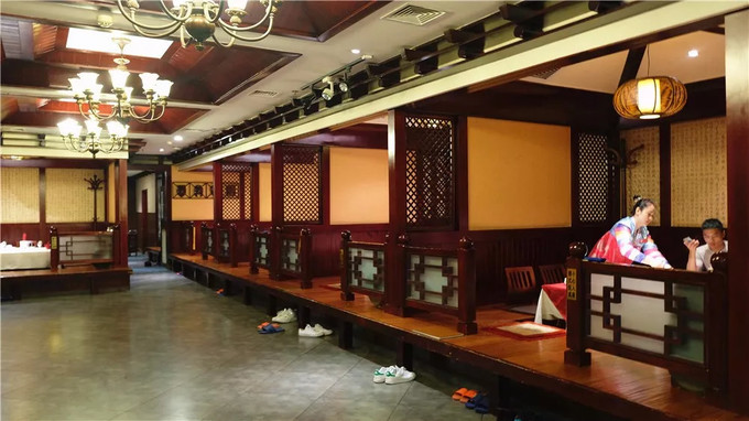 這個(gè)飯店里的陳設(shè)和布局,都是有著鮮明的朝鮮特色的,墻紙、掛飾、裝修調(diào)調(diào)暖色而濃重。