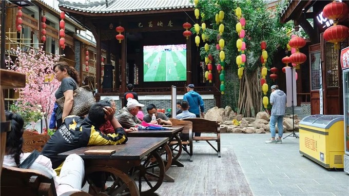 和很多仿古的景區(qū)一樣,在區(qū)域中心位置,都會(huì)有個(gè)戲臺(tái)。我們?nèi)サ漠?dāng)天,戲臺(tái)的大屏幕上在播放世界杯的比賽,引來很多人流連。
