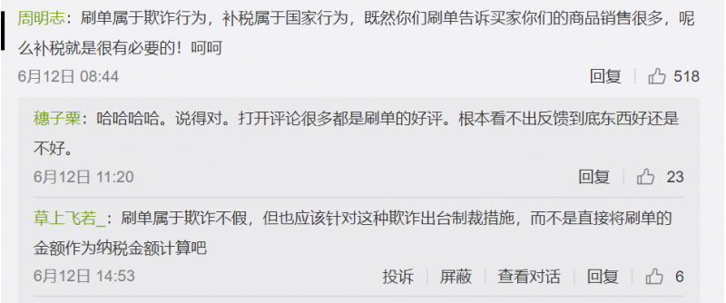 “全部收入里可能有一部分是我們花錢刷出來的,其實并沒有產(chǎn)生這么大的交易額,現(xiàn)在要求對這部分收入繳稅,實在是有苦說不出,因為刷單行為在平臺是不允許的,我們很難去證明,左右為難。”一名網(wǎng)店老板表示。