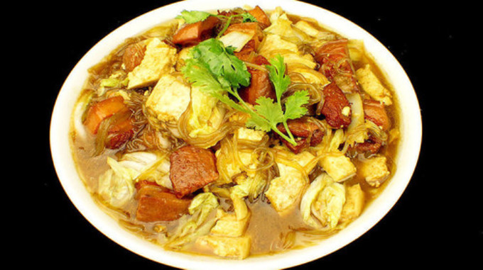 五臺(tái)山的特色菜,由本地產(chǎn)的土豆,粉條,豆腐、丸子和燒肉等燴制而成,也是當(dāng)?shù)厝思壹覒魬舻囊坏兰页2恕?
