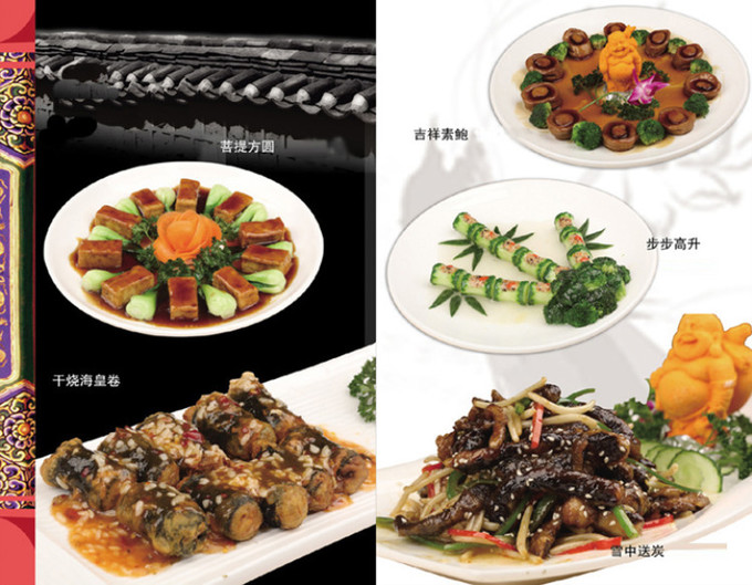 五臺(tái)山的素齋是用豆制品、面精、蔬果等為原料,通過(guò)精心的工藝制作和蒸、煮、炒、燒、燉烹調(diào)而成,如果您看著端上來(lái)的是條魚(yú),吃起來(lái)也是條魚(yú),但它卻是一道素齋。