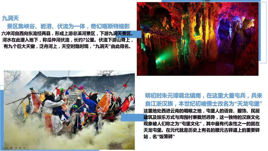 早餐后前往1989年與黃果樹瀑布一道被評(píng)為貴州省十大風(fēng)景名勝區(qū)之一的九洞天。九洞天是國(guó)務(wù)院授予國(guó)家級(jí)重點(diǎn)風(fēng)景名勝區(qū)之一,是烏江干流六仲河上游流經(jīng)兩縣之間的一段以伏流(當(dāng)?shù)厝私嘘幒樱榇淼目λ固鼐C合地貌。該段伏流時(shí)隱時(shí)現(xiàn),神奇莫測(cè),形成地下河,當(dāng)?shù)厝朔Q瓜仲河,長(zhǎng)約7公里,在下游長(zhǎng)約6公里的河段上,箱形切割頂板多處塌陷,形成了大小不同,形狀各異的天窗洞口,使伏流明暗交替,洞洞相連,組合成集伏流、峽谷、洞穴、天橋、天坑、及生物化石為一體的雄奇瑰麗的巖溶大觀。