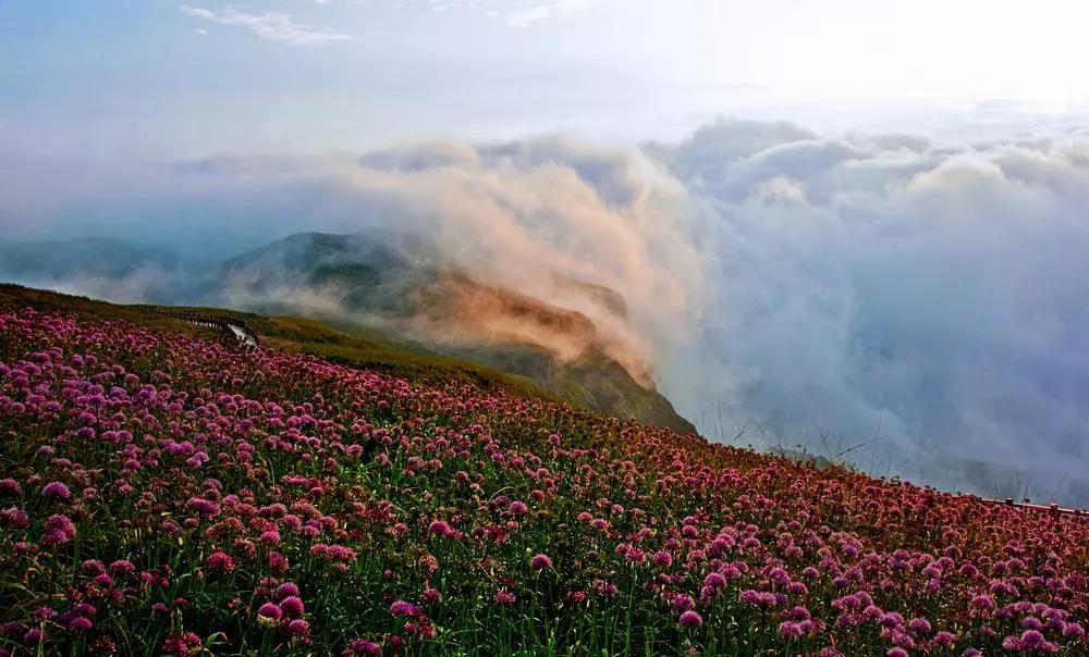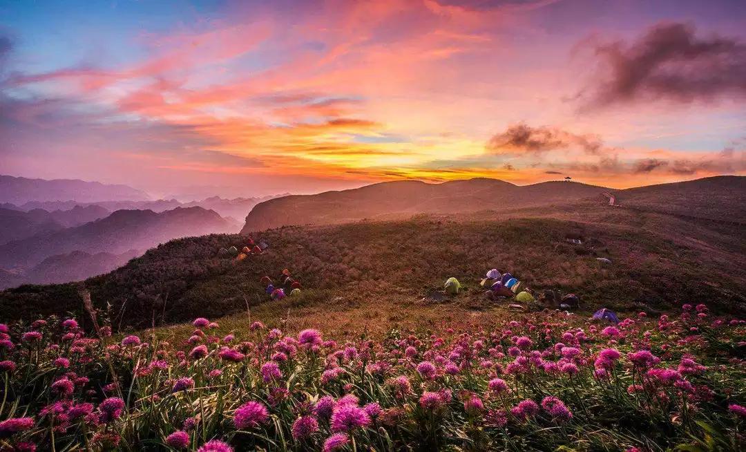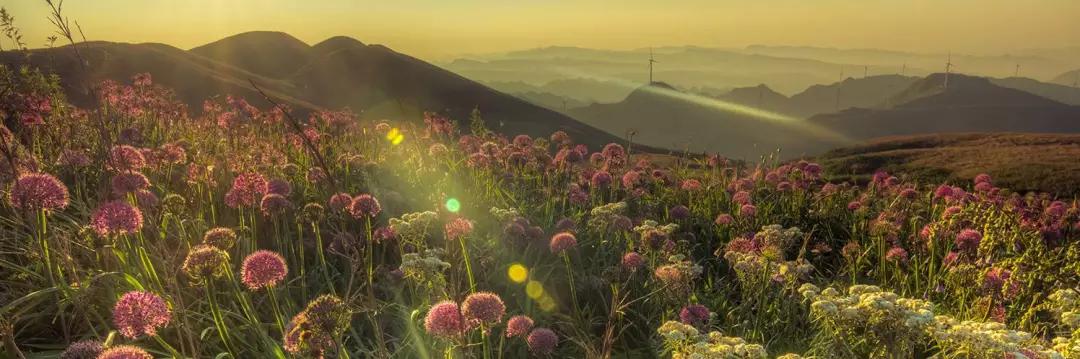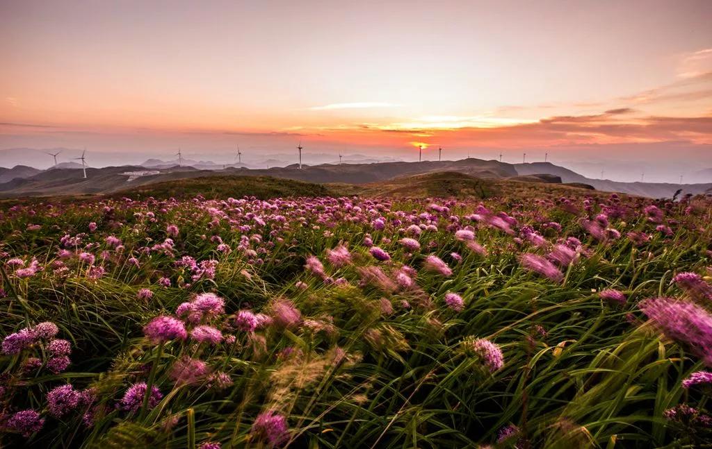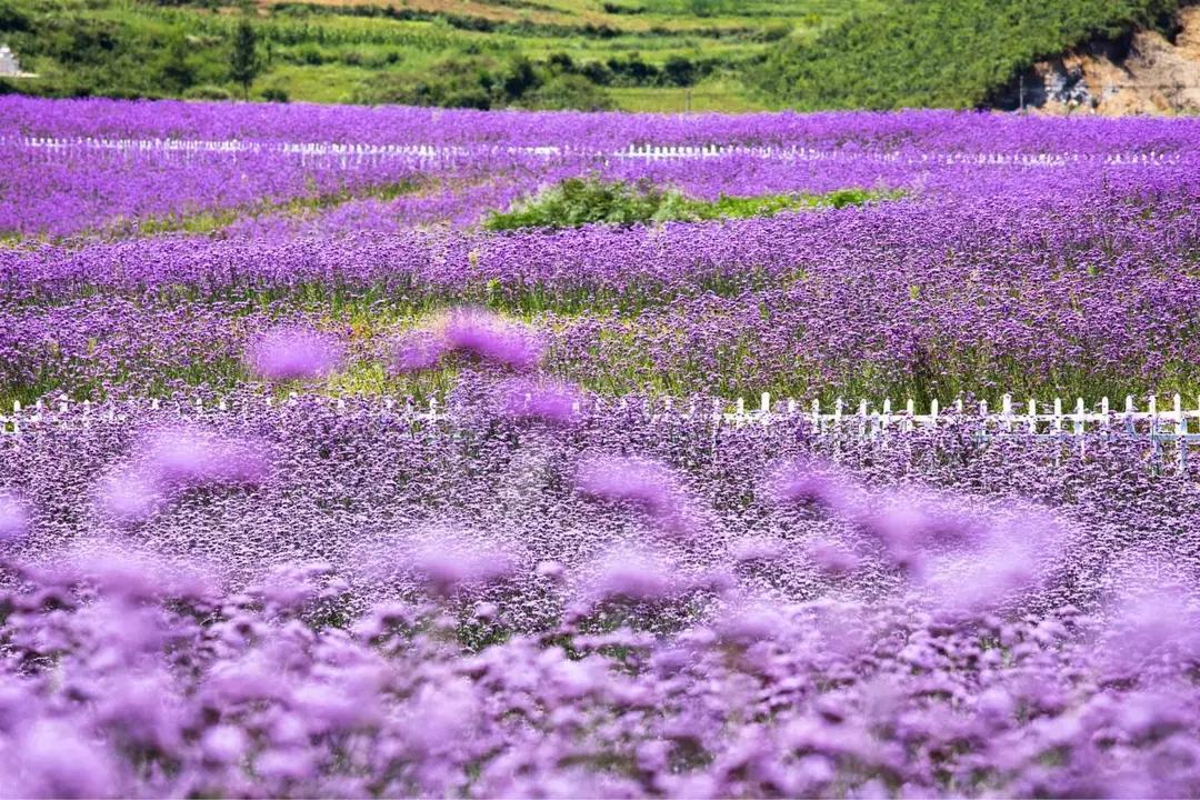 今天我們驅(qū)車來(lái)到云上花海的韭菜坪山腳下,為了能欣賞到韭菜坪最美的日出景象,我們把重頭戲放到了第二天一早,而今天大家在山下游玩拍照,這里盛開著一望無(wú)際紫色的馬鞭草 ,也可以上山去拍一個(gè)日落霞光哦。