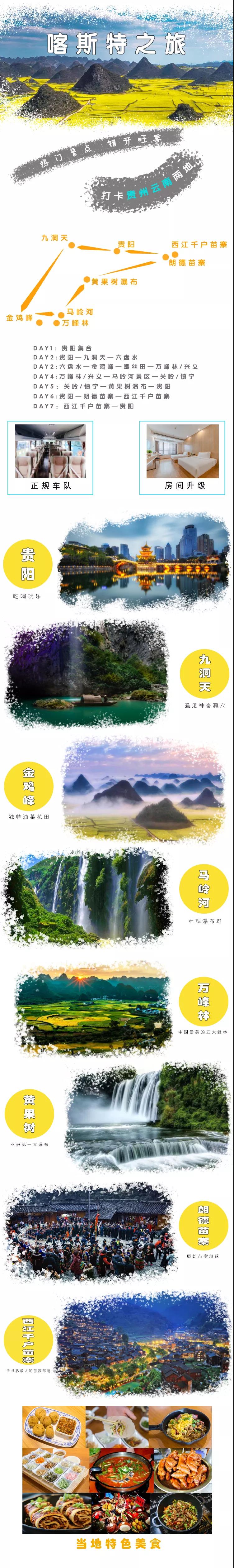 4. 門票:黃果樹(shù)門票及觀光車、西江千戶苗寨門票及觀光車、朗德門票及觀光車、馬嶺河+萬(wàn)峰林門票及觀光車、小火車(不含電梯)、九洞天門票及船票;