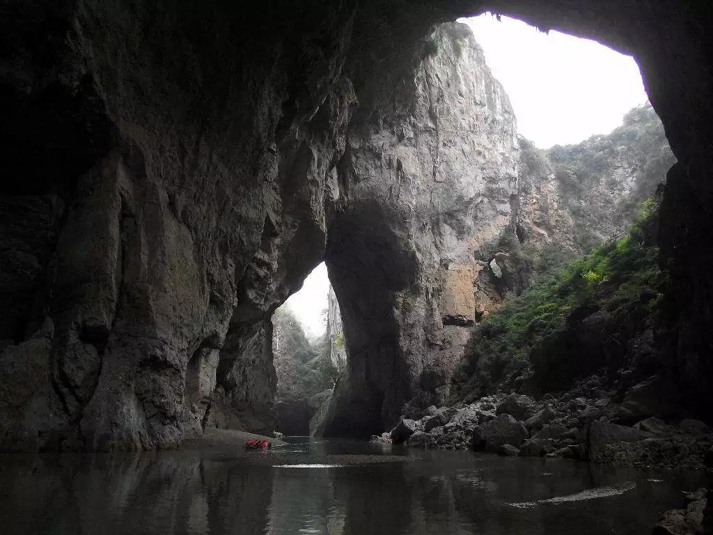 在這一段長(zhǎng)約2公里的六沖河河道上,箱形切割頂板 多處塌陷,形成了多個(gè)形狀、大小各異的天窗、天坑,是已發(fā)現(xiàn)的天窗天坑最密集的溶洞群,是可供乘船游覽最高大的溶洞群。